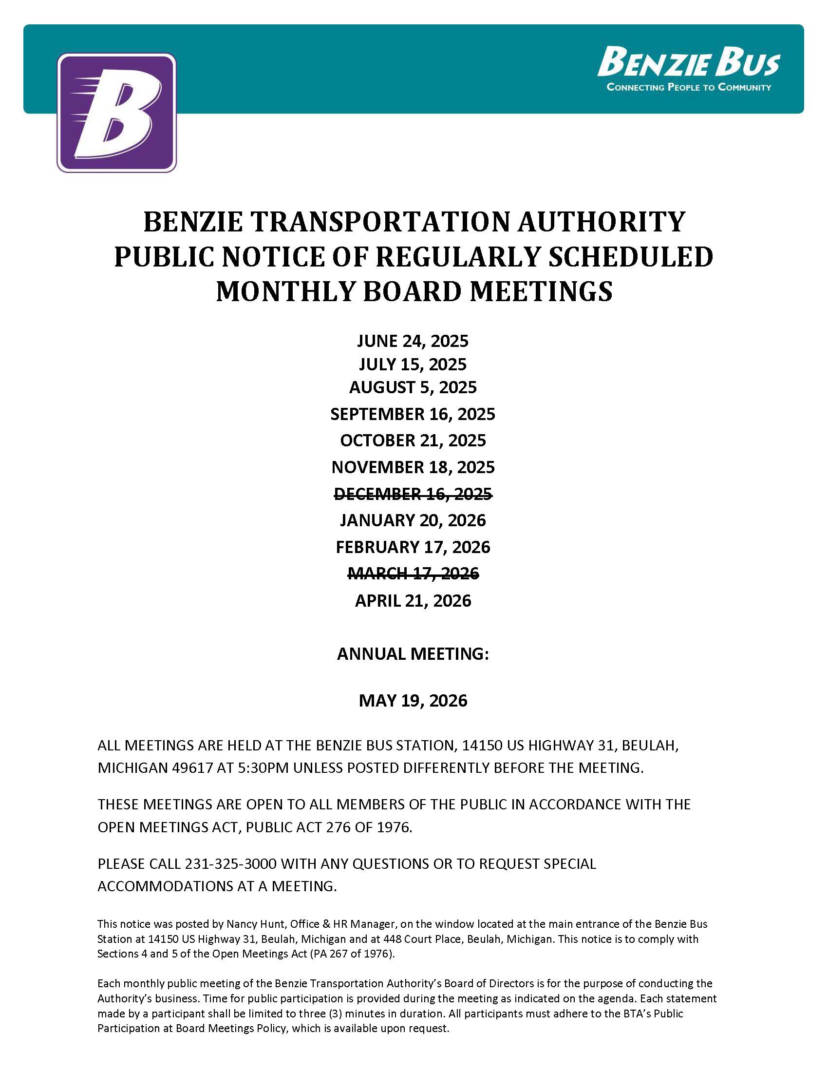 Unless otherwise posted, all meetings will take place at the Benzie Bus office located at 14150 US Hwy 31 Beulah, MI 49617